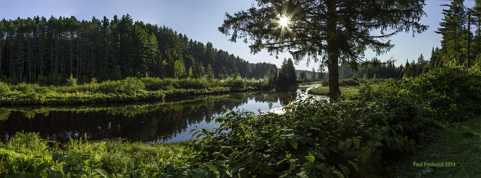 We went camping recently at a very secluded 18,000 acre hunting camp in the upper Adirondack Mountains. I always get up for the sunrise when we go camping. 80-90% of the time, it’s either cloudy or just not much color. Well this time it did not disappoint! The color and clouds were spectacular. I was shooting both video and still pictures so there was flurry of activity for about 8-10 minutes during the peak color. This is a panorama I stitched together in Photoshop from 3 different shots (I then cropped it slightly for better drama):